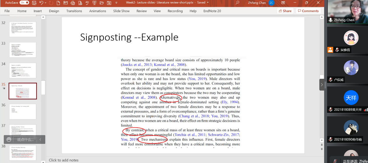 陈之峰老师的系列报告涵盖上市公司年报介绍、期刊文献阅读、学术论文写作、研究方法导论、国际科研项目联合申请等多个话题。陈之峰老师在学术报告过程中深入浅出,通过案例和思考题等方式充分调动学生的积极性,增强师生互动,启发学生思考和总结,并十分注重培养学生的创新能力和批判性思维。