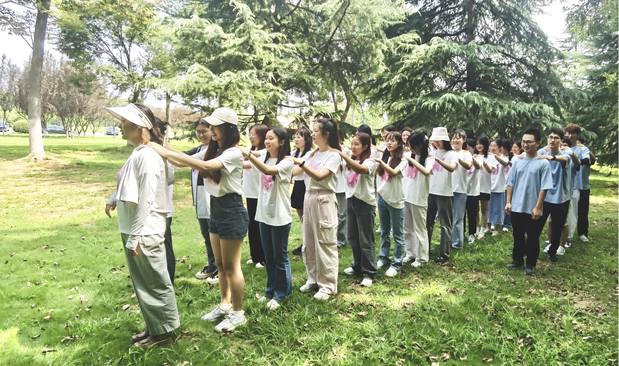素质拓展活动由破冰游戏和团队竞赛两部分组成,教练通过“肩膀捏捏”活动,帮助大家迅速破冰,并指挥同学们组建了三个团队,以便组织开展团队竞赛。