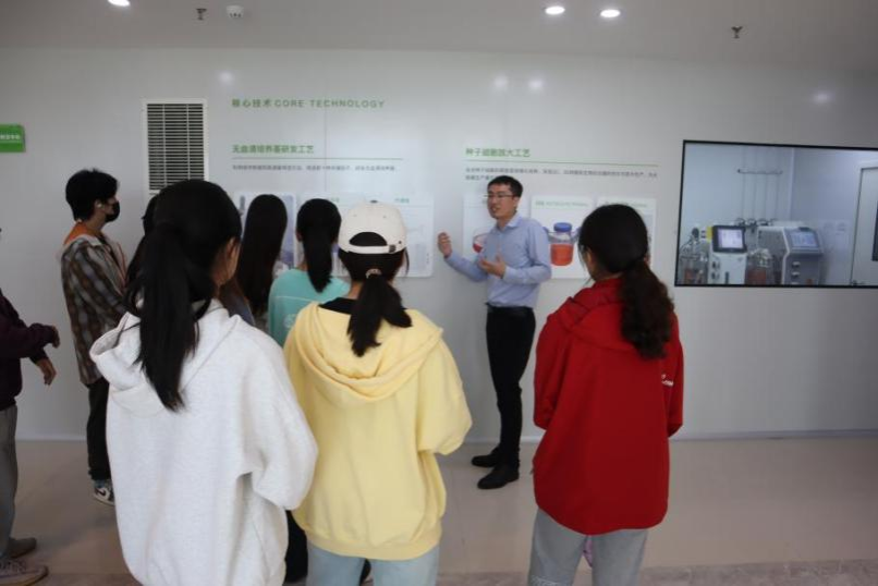 实验室基地处张桂荣老师向同学们介绍了基地的基本情况,帮助同学们了解基地过去10年的飞速发展。同学们依次参观了菊花种植园、水稻实验田、葡萄种植实验室等,并前往红薯种植田开展耕读教育,体验劳作的乐趣与丰收的喜悦。随后,同学们还参观了白马农高区细胞培养肉研究中心,了解细胞培养肉的诞生过程,获悉行业发展前沿。