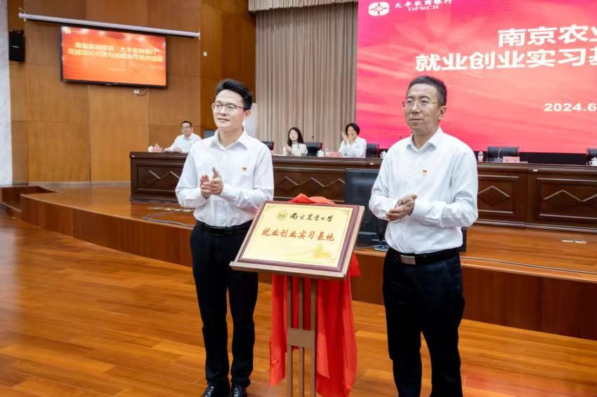 朱珠与章勇进行人才培养、就业实践合作签约,并为“南京农业大学就业创业实习基地”揭牌。