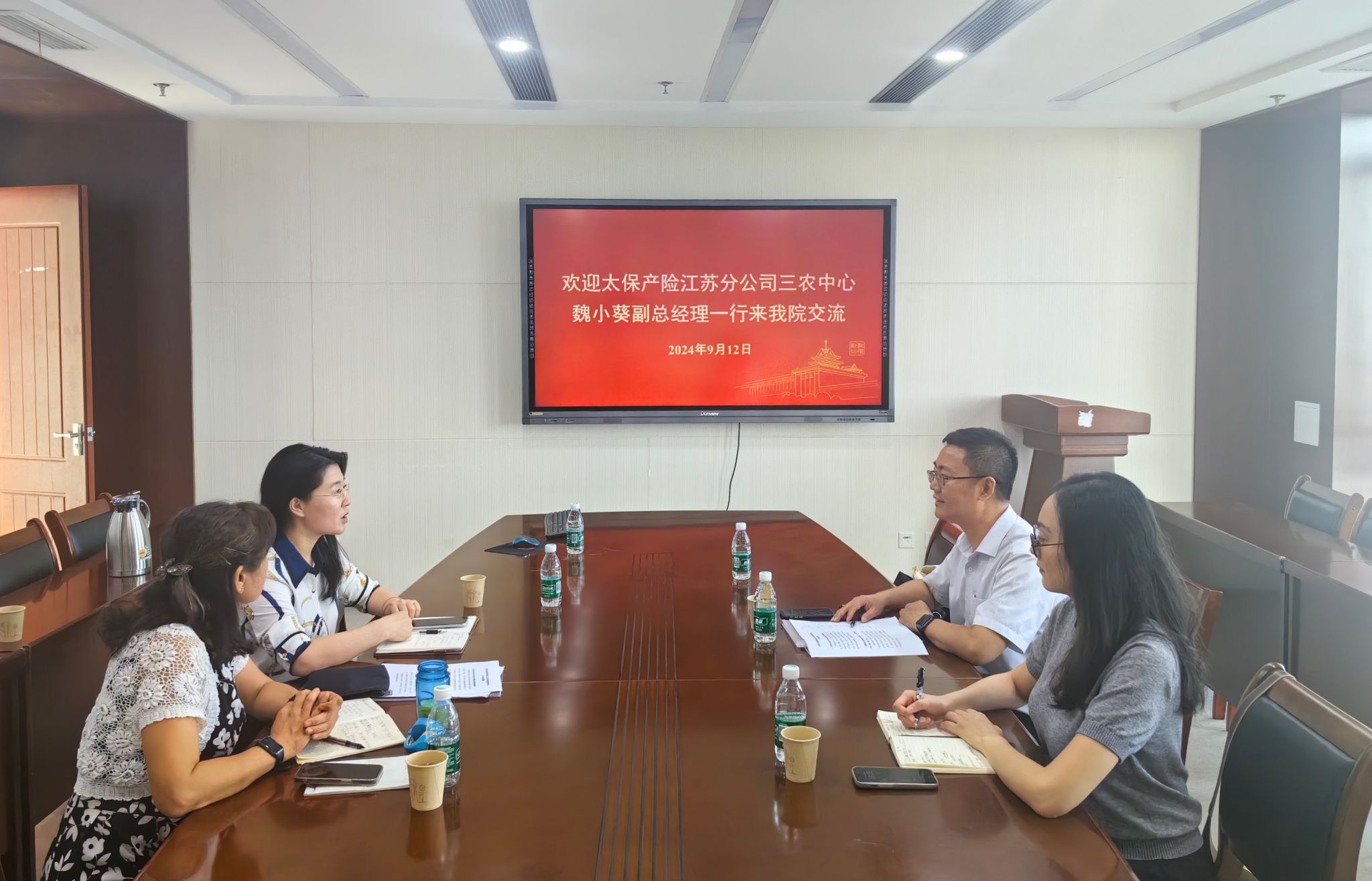 魏小葵副总经理介绍了太平洋保险江苏分公司、太平洋保险农业保险研究院的基本情况。太平洋财险江苏分公司为了提高资产经营水平更高层次服务三农成立了太安农险研究院江苏农业风险管理研究中心,中心专注于地方特色农业发展的区域研究,紧贴江苏农业实际情况,为地区政策的实施建言献策,致力于打造农险领域有行业影响力的开放式研究平台和专业智库。此次来访,希望与学院开展深入合作,共同研究三农领域相关问题。
