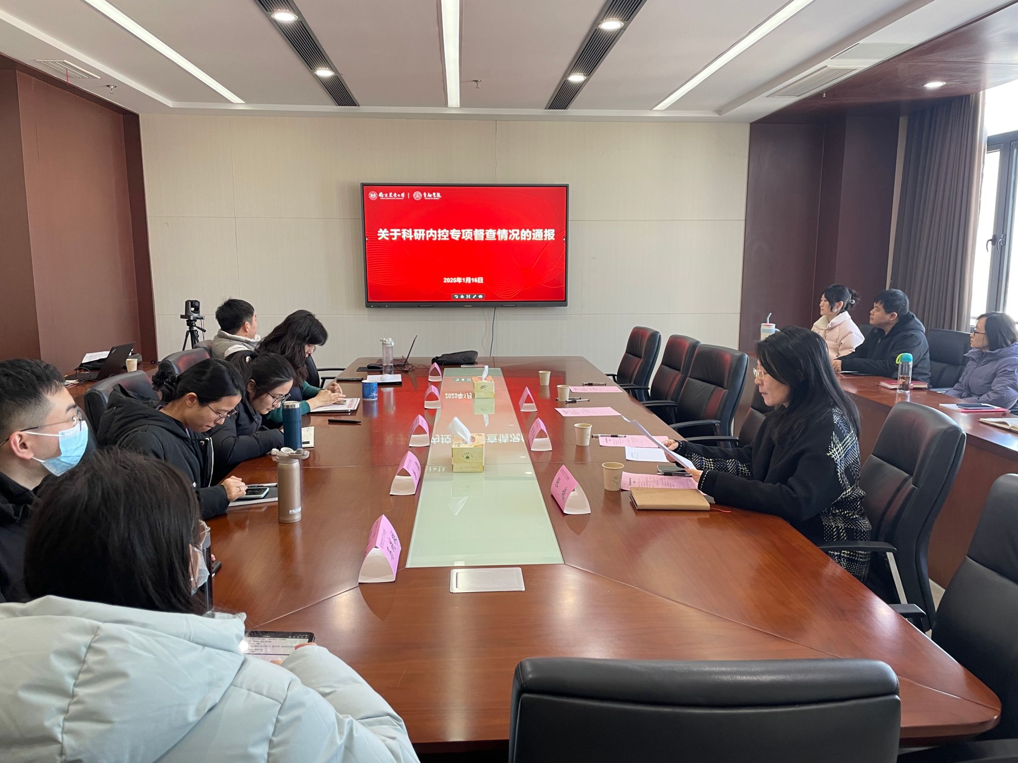 会上,张娆向参会教师传达了《关于科研内控专项督查情况的通报》文件精神,详细解读了督查情况通报文件的内容,包括督查的范围与内容、督查方式、总体情况以及发现的主要问题,并提出了学院科研工作的下一步要求。