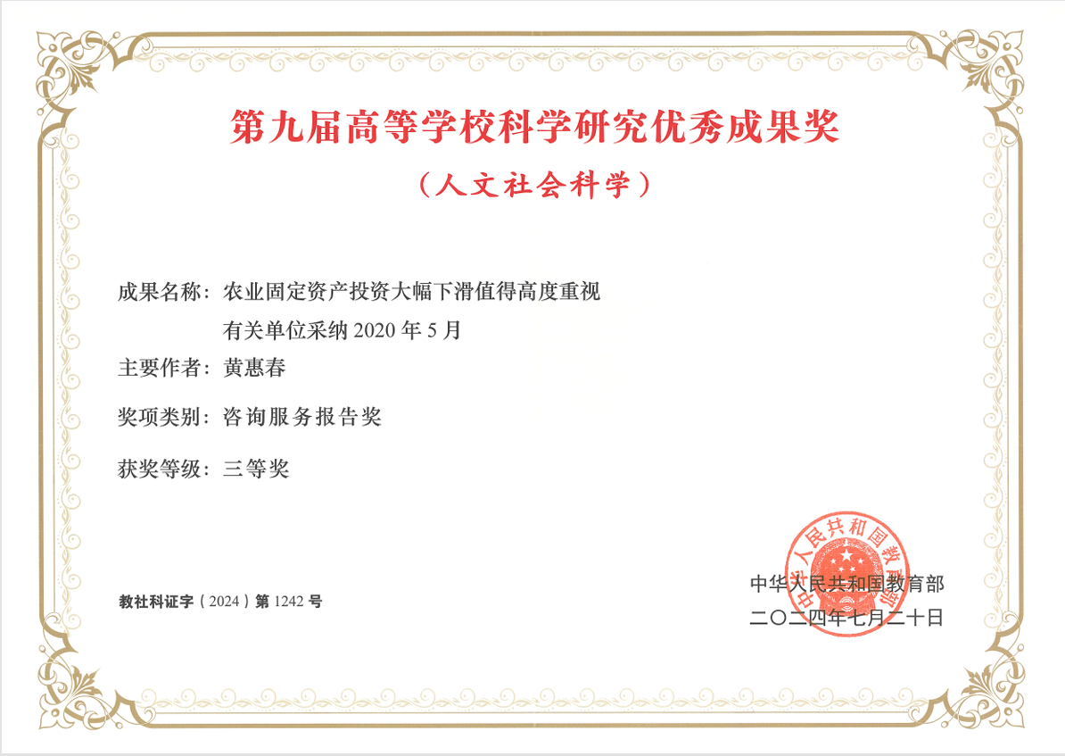 根据教育部发布的《关于第九届高等学校科学研究优秀成果奖(人文社会科学)奖励的决定》(教社科〔2024〕4号),德赢官网黄惠春教授的咨询报告《农业固定资产投资大幅下滑值得高度重视》荣获第九届高等学校科学研究优秀成果奖三等奖。