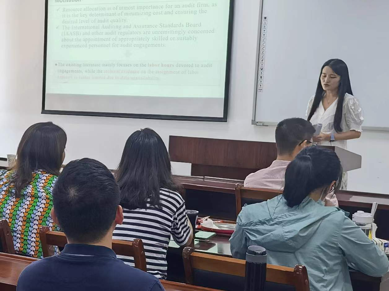 吴雅倩老师和马钱挺老师分别汇报了各自的研究论文。齐荻老师对吴雅倩老师的研究论文做了点评,指出创新点并提出了进一步改进的建议。盛天翔副教授对马钱挺老师的研究论文做了点评,并就马老师论文的结构调整和创新点提炼提出了修改建议。