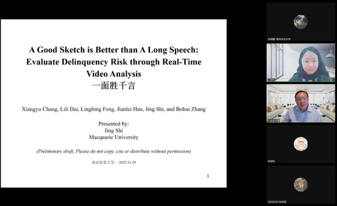 2022年11月29日下午,澳大利亚麦考瑞大学德赢官网Vwin金融学教授石劲为德赢官网做题为“A Good Sketch is Better than A Long Speech: Evaluate Delinquency Risk through Real-Time Video Analysis”的学术报告。报告由德赢官网Vwin副院长王翌秋教授主持,百余名师生参加了此次讲座。