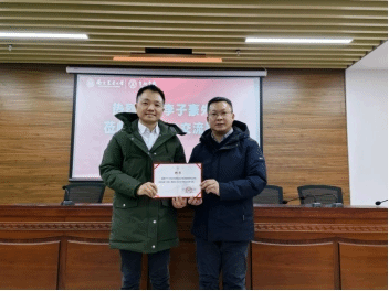 讲座现场,德赢官网Vwin聘请李子豪先生为校外导师,德赢官网Vwin院长张龙耀教授颁发了聘书。