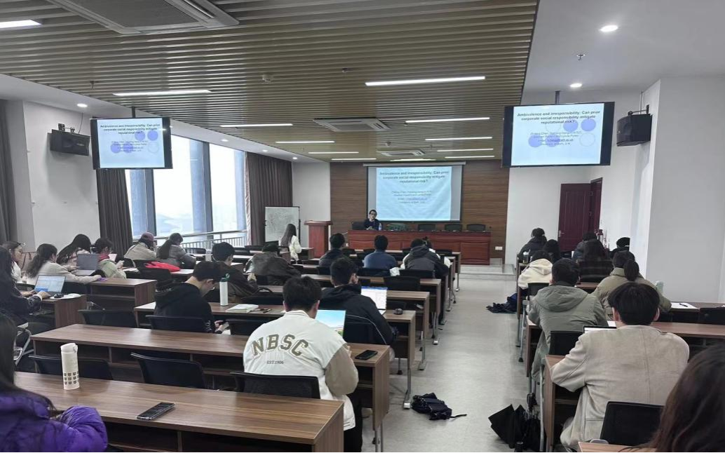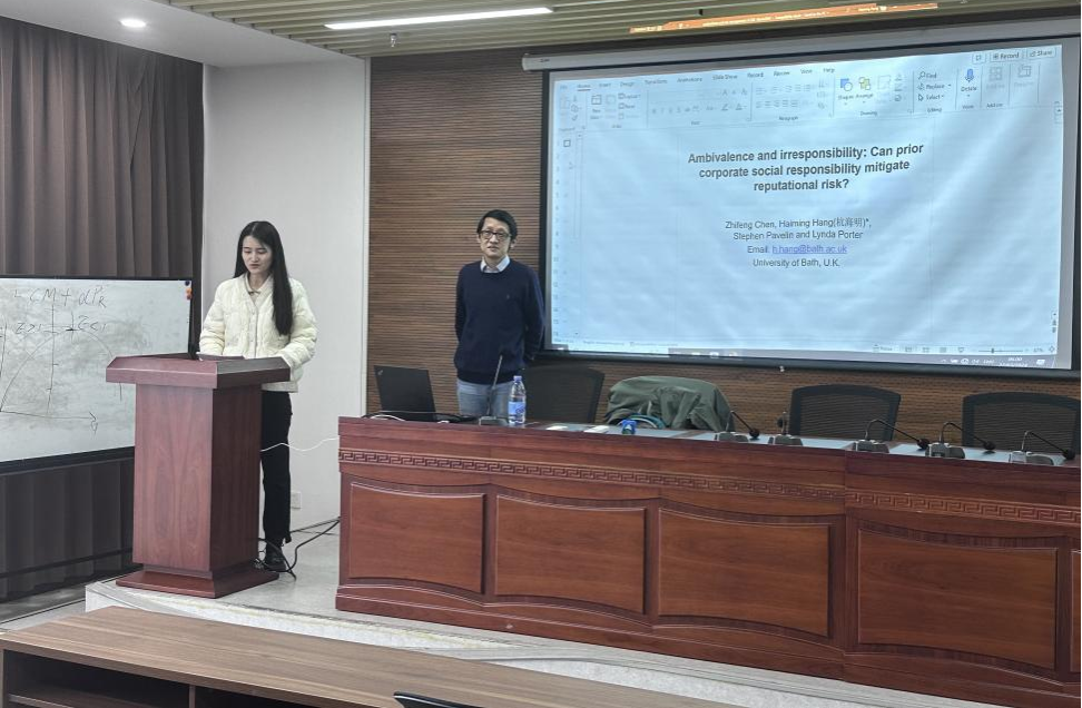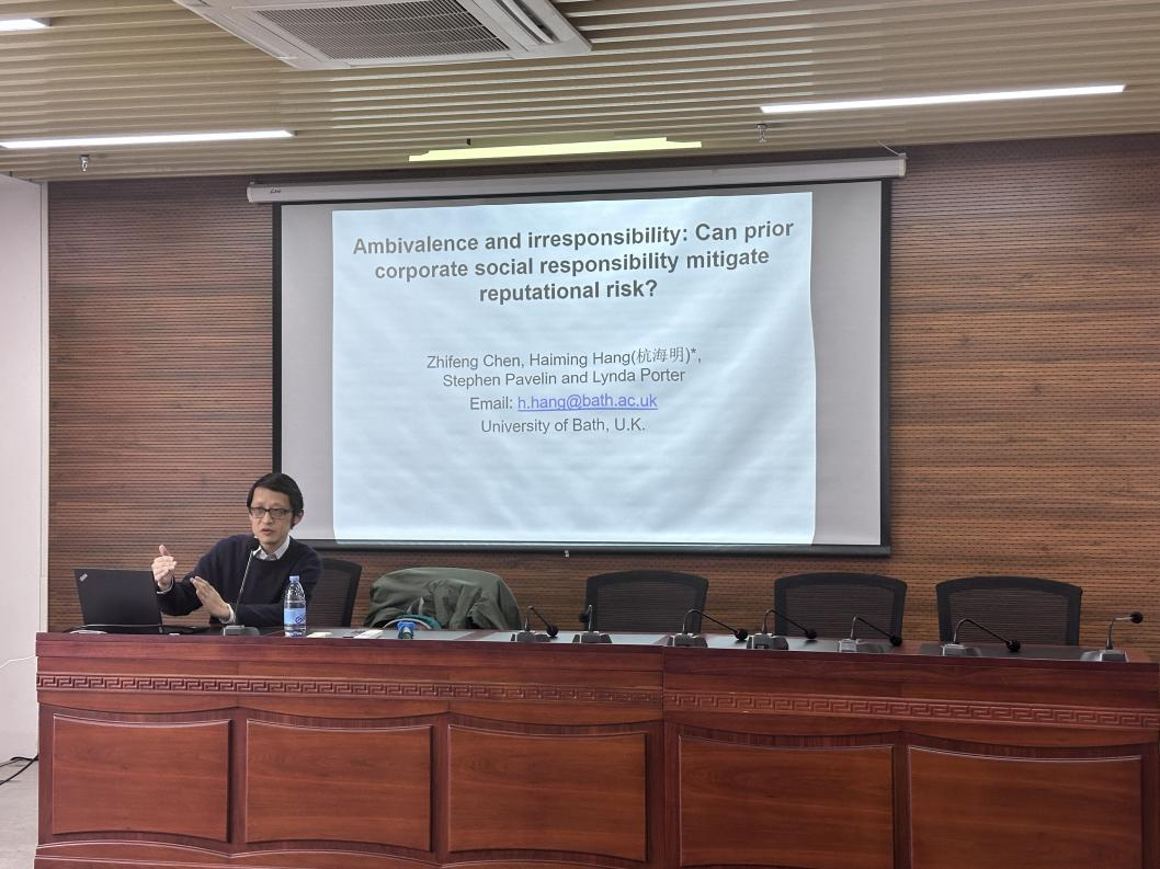 3月27日下午,英国巴斯大学市场营销系杭海明教授受邀为德赢官网做题为《Ambivalence and irresponsibility : Implications for the insurance value of a reputation for corporate social responsibility》的学术报告。报告由德赢官网Vwin吴雅倩老师主持,学院近百名师生参加。